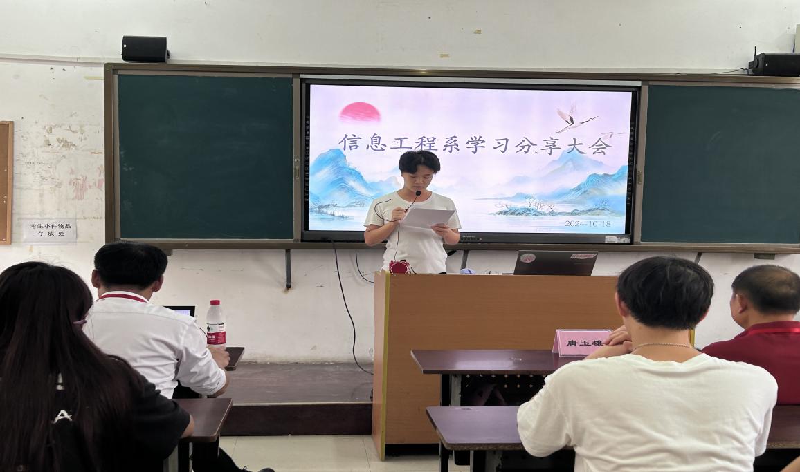 信息工程系讯(通讯员 刘欣怡)为促进学生学习,加强专业技能,促进学生行为规范,促进学生之间的交流与合作,激发大家的学习热情,营造良好的学习氛围,提升个人表达能力,10月18日下午,我系在509教室举行了信息系工程系学习分享会。系主任唐玉雄、系党支部书记罗雄、系副主任廖庆军、陈湘东、综合教研室主任李锋、团总支书记何婷和相关老师及各班班长、副班长、学习委员及部分同学参加此次活动。