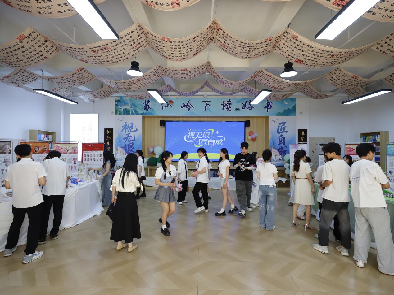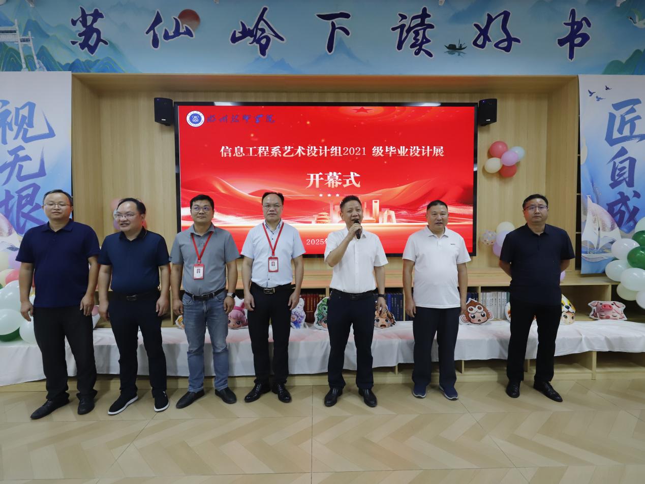 信息工程系讯 (通讯员 黄园)6月25日,我院信息工程系2021级学生毕业设计展在图书馆一楼读书吧举行。学院党委书记胡强,党委副书记、院长肖武云等院领导亲临现场观摩指导,相关部门负责人共同出席,与师生共享这场创意与创业交织的青春盛会。展览以“视无垠·匠自成”为主题,汇聚计算机广告制作与室内设计两大专业成果。