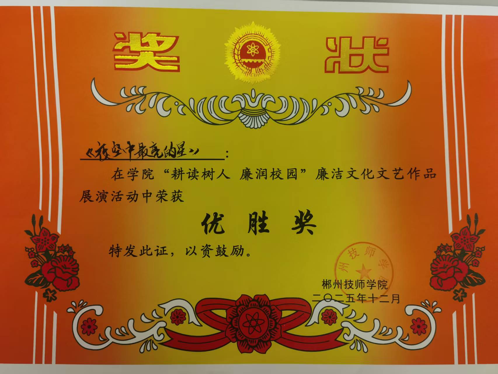 他们凭借扎实的表演功底和真挚的情感表达,为我系斩获朗诵《廉洁颂》三等奖与合唱《夜空中最亮的星》优胜奖。此次活动不仅为同学们提供了展示自我的舞台,更让“耕读树人”的育人理念与“廉润校园”的价值追求深入人心。